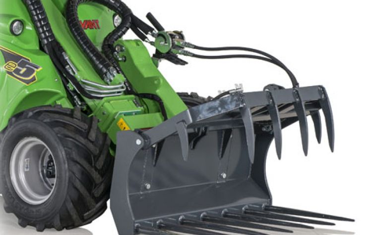A robust silage fork equipped with a powerful hydraulic cylinder, can be fitted on all Avant loader models.