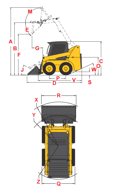 C - Weight of base unit with standard equipment, standard tires (heavy-duty flotation), standard dirt-construction bucket and 79 kg operator.